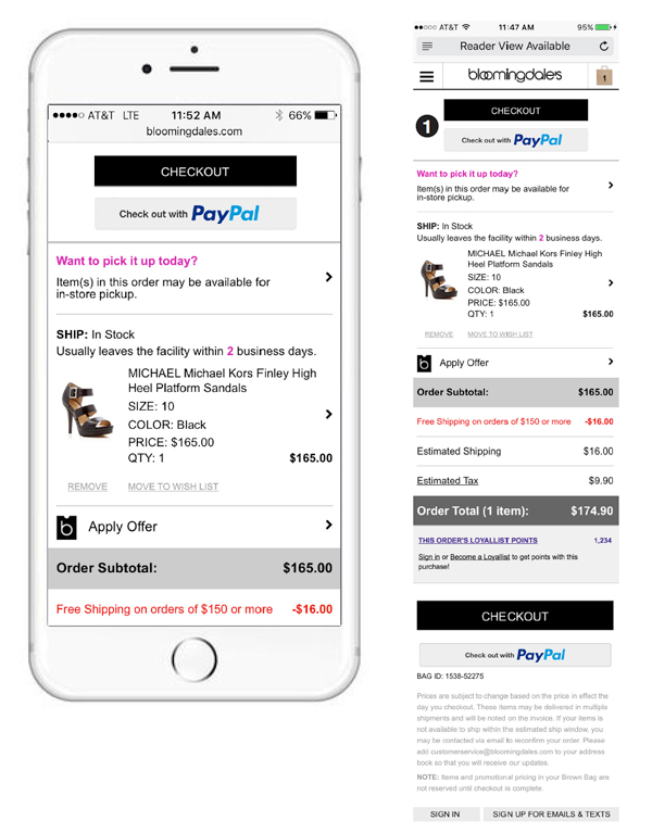 A/B tested the checkout buttons on the top of the mobile bag. Customer Problem: the checkout buttons were hidden at the bottom of the bag making it a longer process for the customer to checkout. We tested another set of buttons at the top of the bag. Although the results were positive, we opted to redesign the bag.