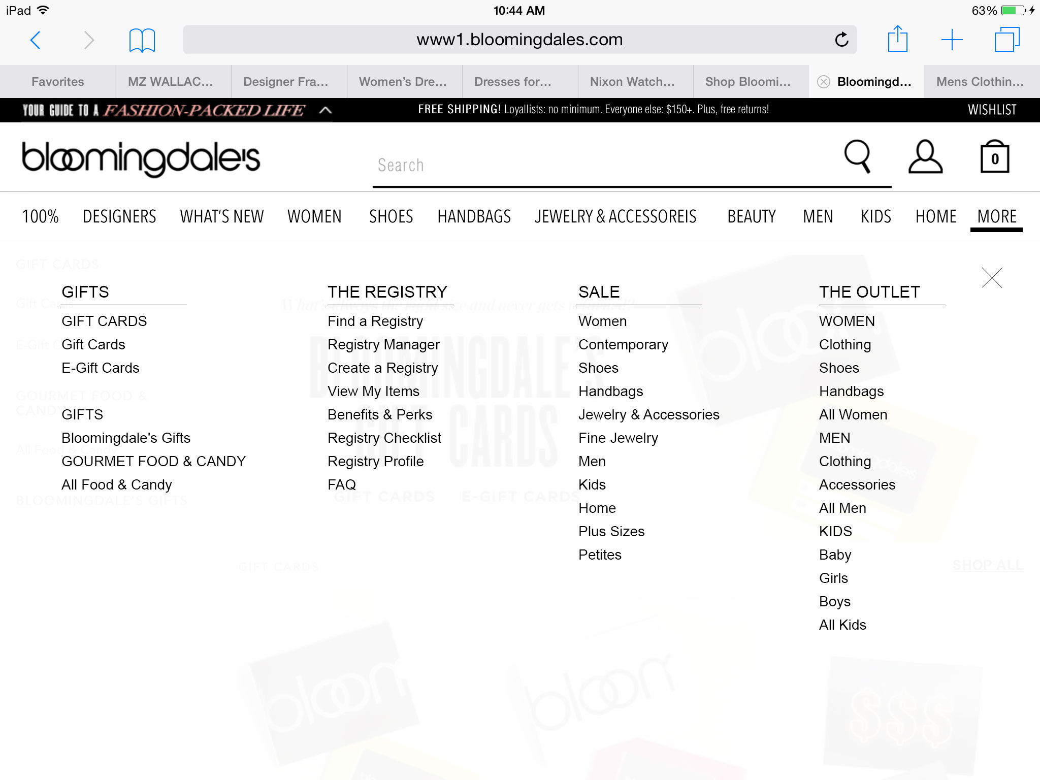 Customers are not aware the tablet navigation swipes making it difficult to get to the other categories (Registry, The Outlet, & Sale). A proposed solve was to add a "more" button to include the additional main categories in the top header. There was an additional issue with the input field for the search. When a customer would type in the search bar, the search bar would disappear. This is a result of an iOS bug. The proposed recommendation was to make the search be in a full screen modal to prevent the disappearing input field.